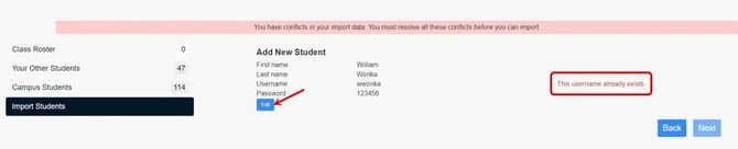 If there are no conflicts in your student data, click Next to complete the import. If there are, you will see a message indicating why. In the example below, the Username is already in the system; therefore, it must be changed before this import can be completed.