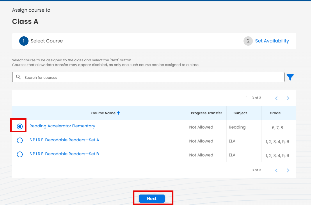 A list of available unassigned courses will be displayed. The list can be searched or filtered to find specific courses. Use the radio button next to the course name to select the course and then select NEXT.