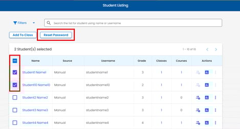 Select the checkbox next to the student(s) name, select the RESET PASSWORD button.