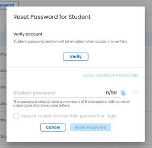The Reset Password for Student pop-up will be displayed: