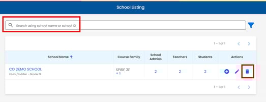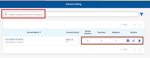 The School Listing includes School Name, Course Family, School Admins, Teachers, and Students. Selecting any of the blue links will give you more information about that field. Selecting the School Name will open the School Details page for viewing/editing.