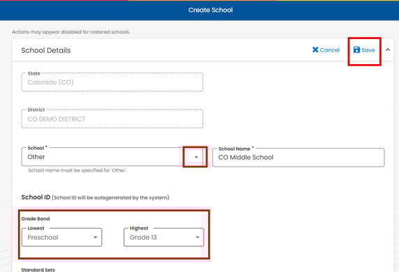 Enter the School Name, select the highest and lowest grades from the drop-down menus, and select Time Zone from the drop-down menu. Select Save.