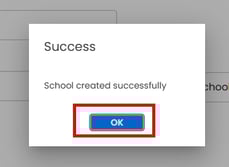 A pop-up will confirm that the School was created successfully. Select OK to close.