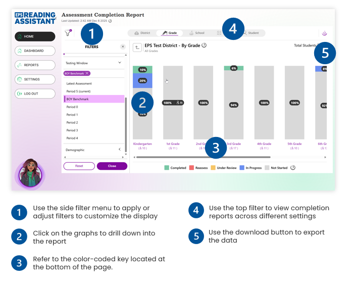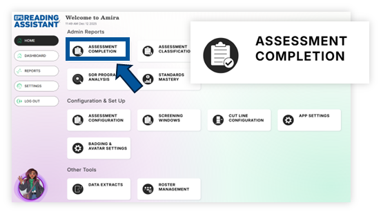 The Assessment Completion Report provides administrators with a clear overview of student assessment status. This report helps educators quickly identify which students have completed their required assessments and who still needs to be assessed or reassessed. This report updates daily.