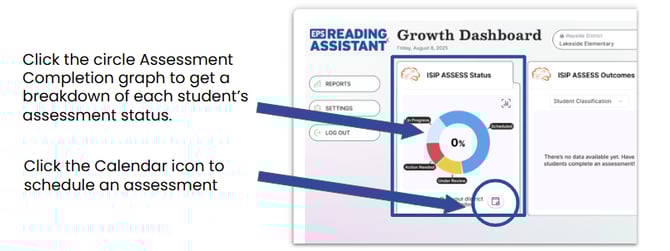 Use the ISIP Assess tile to review current assessment status or schedule a new assessment. You’ll find the ISIP Assess widget on the Teacher Growth Dashboard.