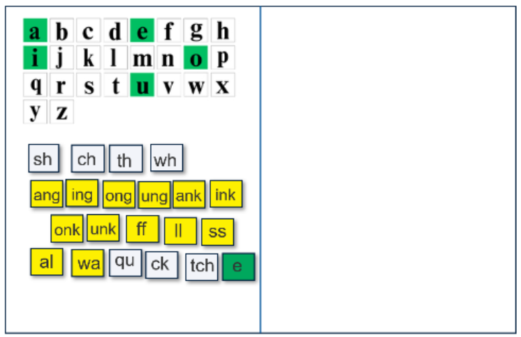 - Beginning of Level: Add letter tiles for the new concepts that are taught for the first lesson on the right side of the board. Organize additional letter tiles in a bag or drawer.